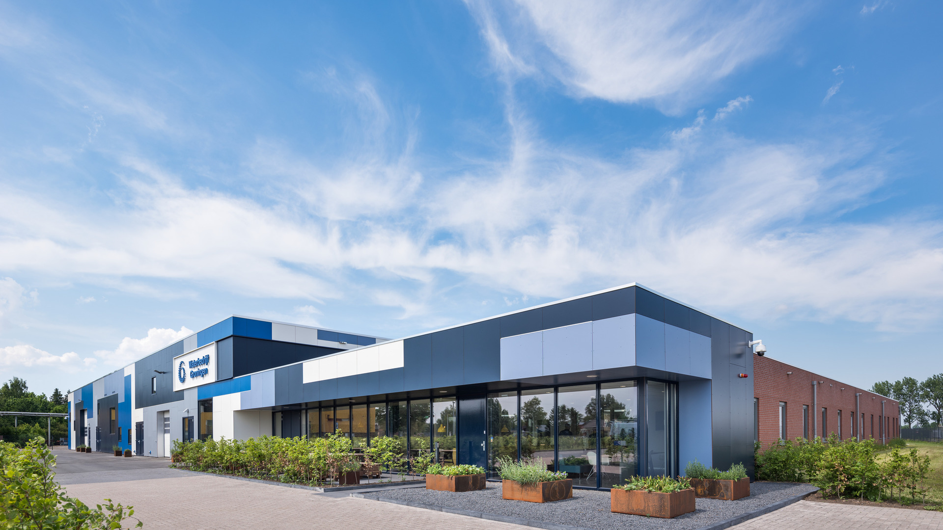 Im Gewerbegebiet Martenshoek Noord im niederländischen Hoogezand wurde eine alte Lagerhalle in ein neues multifunktionales Zentrallager für Waterbedrijf Groningen verwandelt. Das Architektenbüro Team 4 lieferte den Entwurf für diese umfassende Neugestaltung. Die Fassade aus Glas mit blauen, weißen und silbernen Flächen springt sofort ins Auge. Damit spiegelt das Gebäude perfekt die nachhaltige Mission des Wasserversorgungsunternehmens wieder und verweist auf die Lage am Winschoterdiep-Kanal.